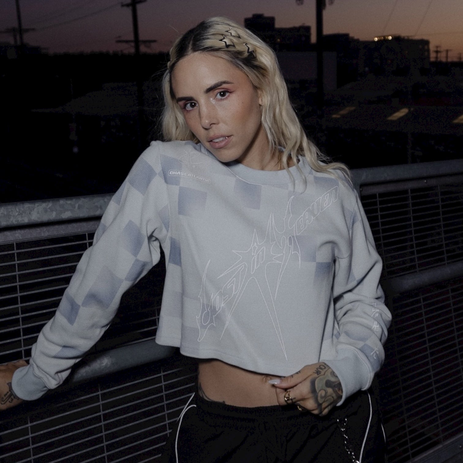 Fully custom light blue women’s long sleeve designed with a relaxed fit and cropped cut. This premium 100% cotton top features a subtle all-over faded checkered pattern with puff print graphics across the chest and sleeve.