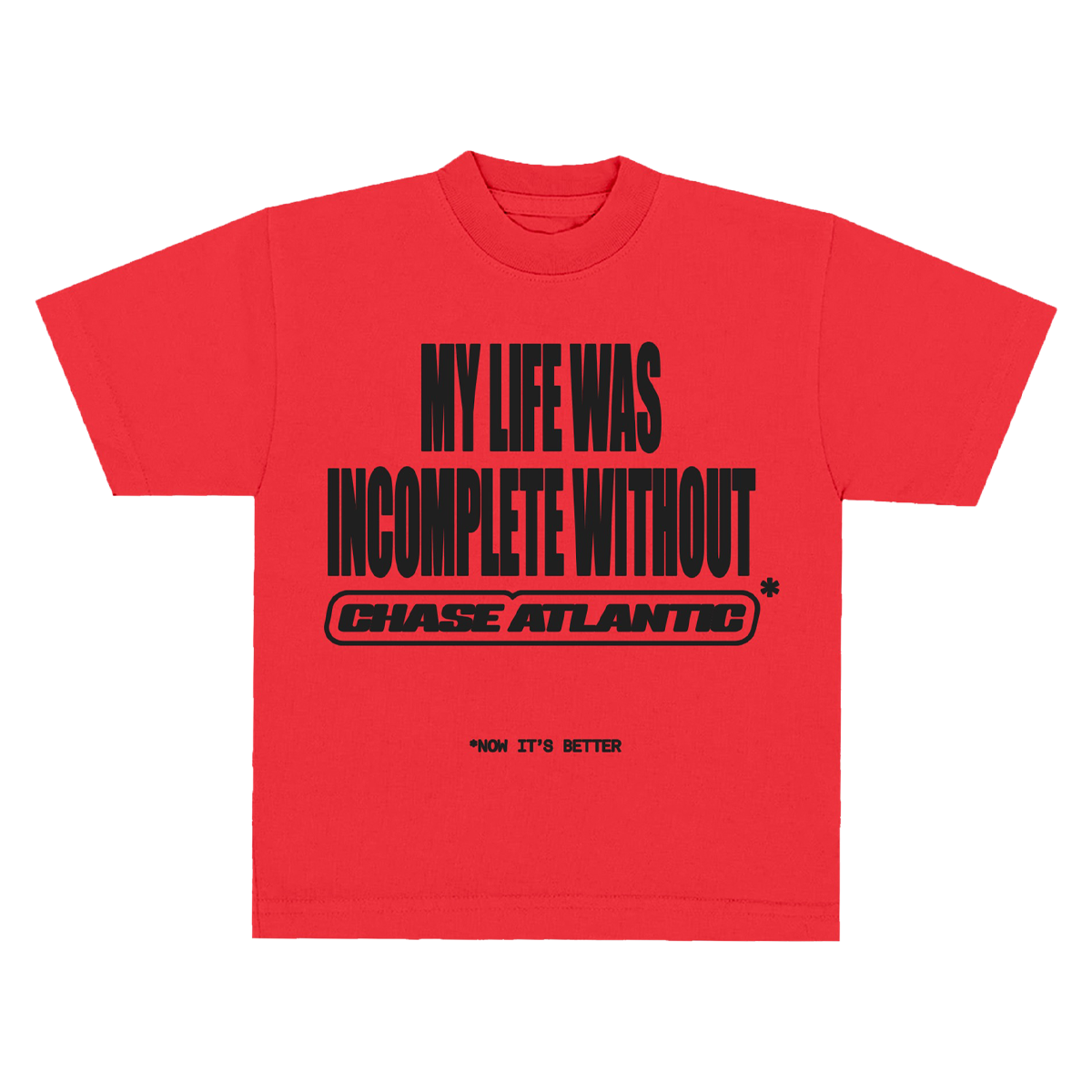 My Life Was Incomplete Without Chase Atlantic design printed on the front of a red unisex streetwear essential body.